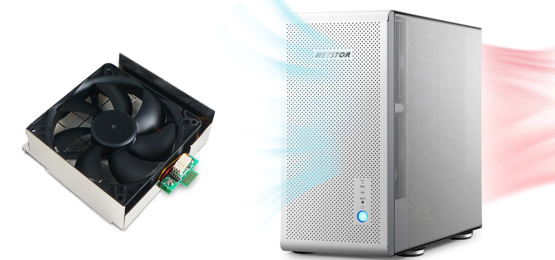 NA255A-G4는 전면에 12×12cm 크기의 대형 냉각 팬 모듈 두 개를 장착했으며, 각 팬은 최대 106 CFM의 풍량을 지원합니다. 섀시 내부로 최적의 공기 흐름을 제공하여 방열 효과를 극대화하는 동시에 섀시 내 GPU 카드가 고온 문제 없이 장시간 연속 작동할 수 있도록 보장합니다. 또한, Netstor 유닛 내 GPU의 사용 환경에 따라 각 냉각 팬의 속도를 수동으로 조절할 수 있습니다.